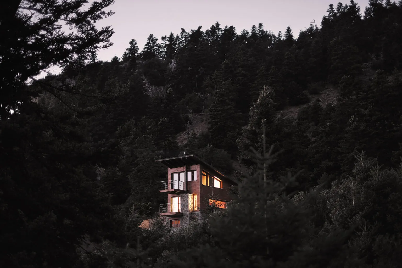 Η κατοικία βρίσκεται στο βουνό και συνομιλεί μαζί του, αφού οι αρχιτέκτονες σεβάστηκαν το εξωτερικό περιβάλλον και δημιούργησαν έναν εσωτερικό χώρο κομψό και με ζεστή ατμόσφαιρα. Κατέφυγαν σε έναν συνδυασμό φυσικών υλικών όπως το ρουστίκ ξύλο, αλλά και η διάτρητη λαμαρίνα που χρησιμοποιείται στο βιομηχανικό σχεδιασμό. Στα μπάνια υπάρχουν λεπτή περσιδωτή ξυλεία και τρισδιάστατα πλακίδια μωσαϊκού.