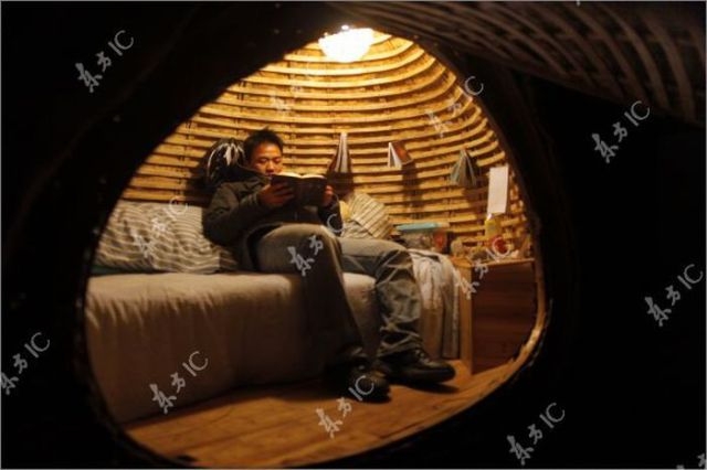 Ο Daihai Fei έφτιαξε ένα πλαίσιο από μπαμπού σε σχήμα αυγού, πάνω στο οποίο τοποθέτησε στρώματα από διάφορα μονωτικά υλικά.